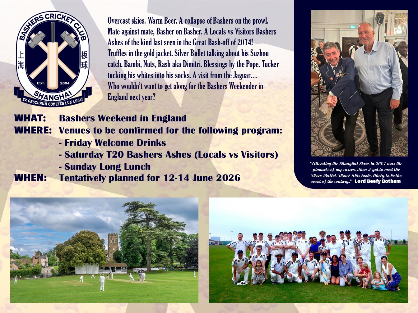 Basher on Bashers, mate against mate, warm beers on a moderately warm afternoon with an overcast sky… Welcome drinks on Friday, 11 UK Bashers against 11 Visitors T20 on the Saturday, Long lunch on the Sunday.